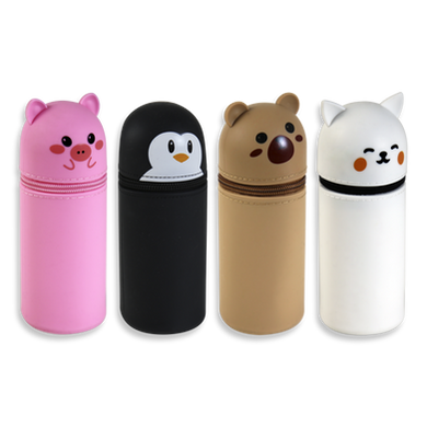 4 assorted Animal Pencil Cases, made with high quality silicone. Featuring retractable bases and a soft touch, these pencil cases offer an excellent storage solution for all your favourite pens, pencils, erasers, and more. Pull the base downward for a larger storage capacity or push upwards to stand on a flat surface. Ideal to help you organise and transport your stationery in style.